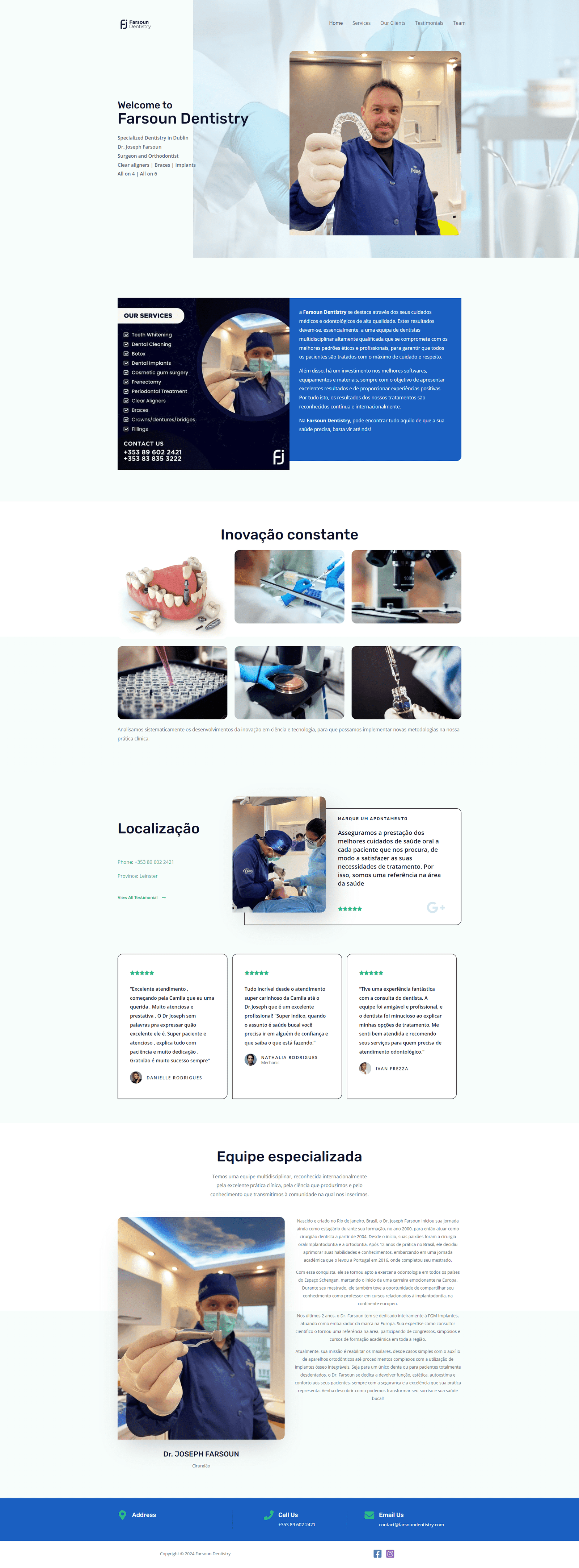 A localização da clínica e as informações de contato são facilmente acessíveis, facilitando o agendamento de consultas. Os testemunhos de pacientes satisfeitos reforçam a confiança nos serviços prestados. A apresentação da equipe especializada, especialmente do Dr. Farsoun, humaniza a clínica e cria uma conexão mais próxima com os visitantes.